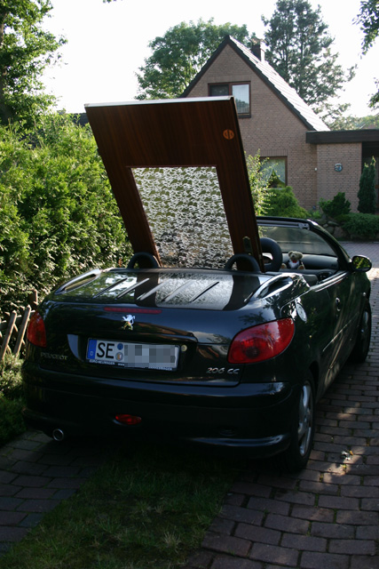 Tja, dann kam heute noch der Frank kurz vorbei um sein neues Windschott für sein Cabrio zu präsentieren…Ach, nein! Eigentlich hat er nur etwas vorbei gebracht. Der Wagen sah jedoch so abenteuerlich beladen aus, dass ich erstmal ein Bild davon machen musste.