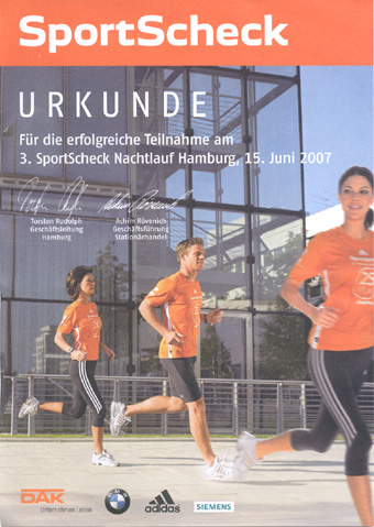 Was soll ich sagen, es läuft sich wirklich schön um die Außenalster. Der Veranstalter hatte jeden vollen Kilometer schön mit Fackeln markiert und ausgeschildert und es sieht schon beeindruckend aus, wenn mehrere 1000 Leute in einheitlichen Shirts herumlaufen (Teilnahmebedingung). Gut, andere Leute laufen in 50 Minuten 10km, aber wir sind dennoch zufrieden mit uns. Das war wirklich ein schöner Lauf.