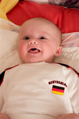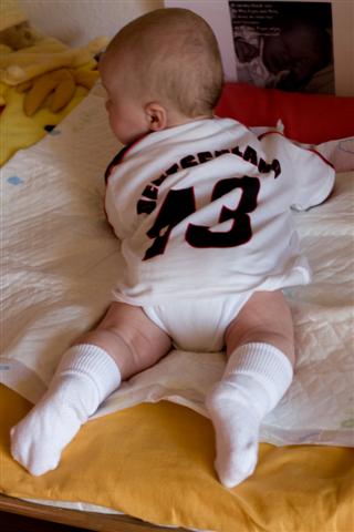 Tja, es waren schon zähe Verhandlungen, aber nach einer nicht unerheblichen Ablösesumme konnte Jona nun heute ihr Trikot in Empfang nehmen. Es hat zwar einige Überredungskunst gekostet, aber sie hat sich bereit erklärt die Nummer ’13‘ von Herrn Ballack aufzutragen 😉